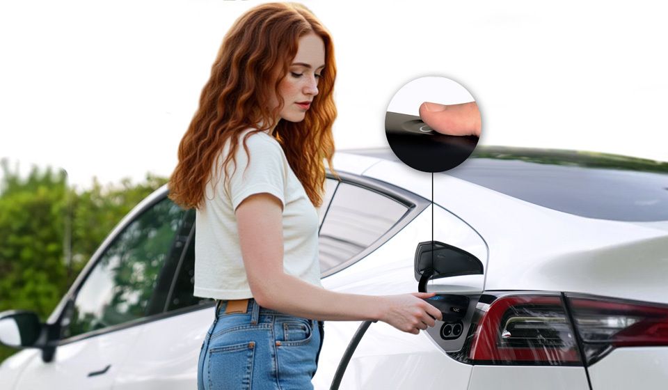 Este cargador ofrece la mejor experiencia de carga porque esta versión de Trydan incorpora de serie un cable de carga con botón integrado para Tesla, una solución innovadora que permite abrir el puerto de carga y desbloquear el cable directamente desde el conector, sin necesidad de utilizar la app, la llave ni acceder al interior del vehículo.